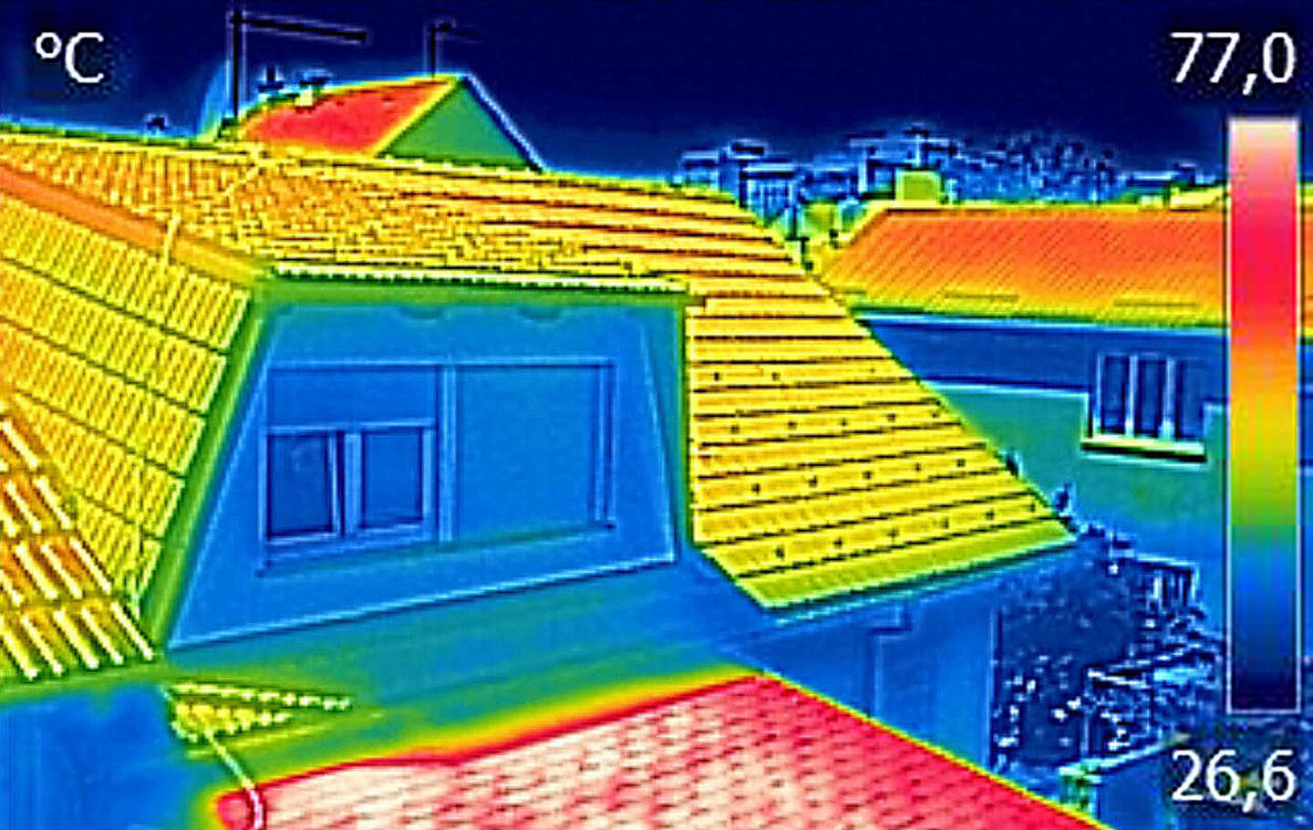 Infraroodbeelden van gebouwen of landgoederen om temperatuurschommelingen zoals warmteverlies of waterlekken zichtbaar te maken.